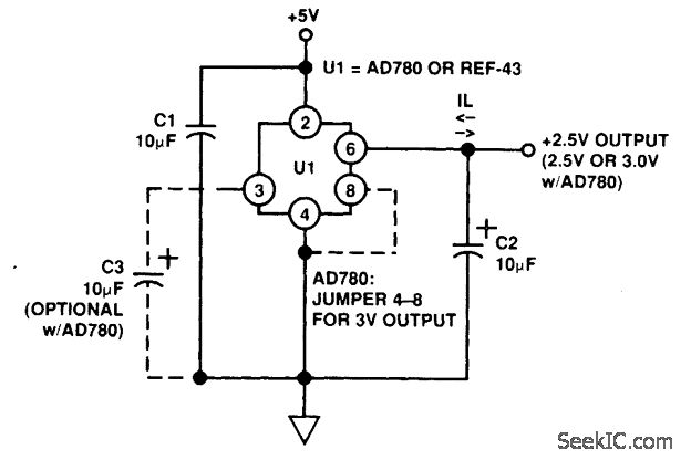 For op-amp circuits, a pseudo ground is often needed; a voltage reference IC can be used. The Analog Devices AD780 is used here for this application. This can sink or source current.