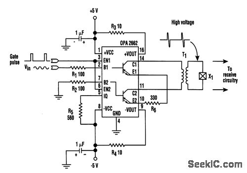 This pulse-echo driver uses the OPA2662 dual operational transconductance amplifier(OTA)from Burr-Brown(the reeeive circuitry isn't shown). The OTA is preferable over an op amp for driv-ing low impedances because it provides a current output rather than a voltage output.Ultrasonic pulse-echo applications often incorporate a transformer-coupled crystal to obtain a high-voltage pulse because the echo can be orders of magnitude smaller in amplitude. The trans-former turns ratio also provides tuning at the resonant frequency of the crystal, which usually means a relatively low-impedance primary winding.An operational transconductance amplifier(OTA)is preferred over an op amp to drive such a low impedance. One particular application involves a pulse-echo driver circuit using the OPA2662.