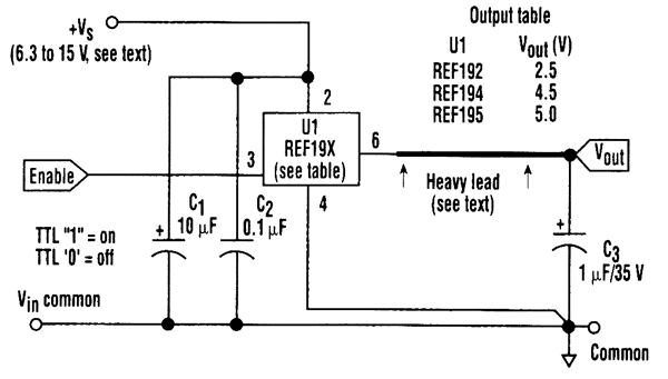 In this high-performance reference circuit, U1 is a device from the REF190 series producing de-vice-selectable outputs of 2.5, 4.5, and 5 V with simple, noncritical external circuitry. An Analog Devices REF 19 X(see the table in the figure)is used to derive a reference voltage.