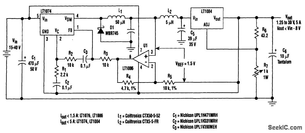 Without the preregulator (for a 40-V input and a 5-V output at 5 A), it would be virtually impossible to find a heatsink large enough to dissipate enough energy to keep the linear-regulator junction temperature below its maximum value. With the prereg-ulator technique, however, the linear regulator will dissipate only 7.5 W under worst-case loading conditions for the entire input-voltage range of 15 to 40 V. Even under a short-circuit fault condition, the 1.5-V drop across the LT1084 is maintained.