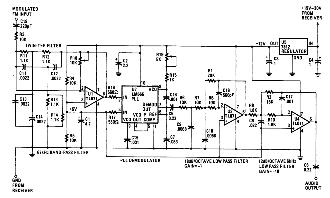 Op amp U1 and its associated components comprise the 67-kHz bandpass filter. A twin-T net-work, comprised offour 1100-Ω resistors and four 0.0022-pF capacitors, is connected in the feed-back network of the op amp. That gives some gain at 67 kHz and heavy attenuation for frequencies above and below that frequency.An additional passive filter at the input to the twin-T network (containing a 220-pF capacitor and a 10,000-Ω resistor) provides some additional roll-off for frequencies below 67 kHz.In practice, the bandpass-filter action covers a frequency range of about 10 kHz above and below the 67-kHz center frequency. Resistor R18 sets the gain of the bandpass-filter stage.Integrated-circuit U2 is a National LM565 phase-locked loop that modulates the 67-kHz fre-quency-modulated (FM) signal from U1. The LM565 PLL consists of a voltage-controlled oscillator (VCO) set to 67 kHz, and a comparator that compares the incoming frequency-modulated 67-kHz signal at pin 2 with the VCO signal that is fed into pin 5.The output of the comparator represents the phase difference between the incoming signal and the VCO signal. Therefore, the output is the audio modulated by the subcarrier. A treble deemphasis of 150 ps is provided by a 0.033-μF capacitor (at pin 7).The free-running VCO frequency is determined by the 0.001-μF capacitor at pin 9 and by the re-sistance between the positive rail and pin 8 (100 Ω in series with R19). Variable-resistor R19 adjusts the oscillator frequency (also known as the centerfrequency) so that the incoming signal is within the lock range of the PLL.