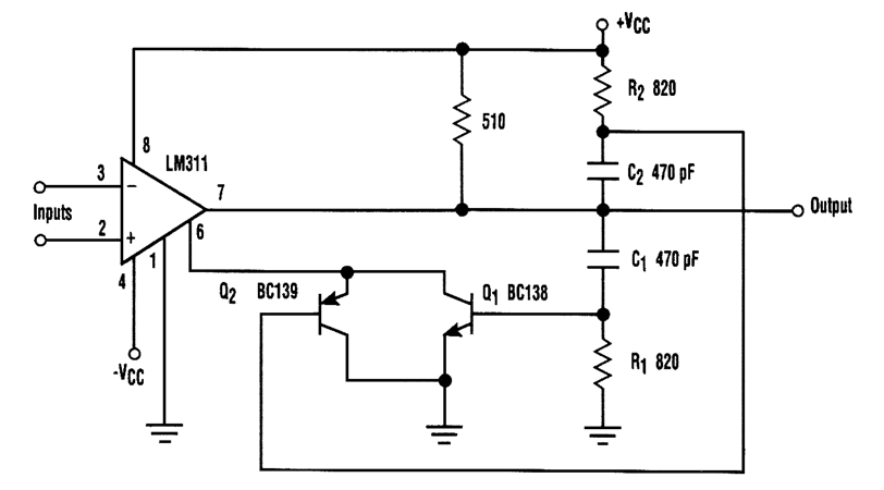 When the comparator's output changes its state from low to high, the rising edge of the output pulse, differentiated by the C1/R1 chain, opens Q1. This blocks comparator M via its strobing input and sustains its output in the H state for a period of time, defined by the time constant R,Ct After C1 is charged by the current flowing through R1, Q1 is shut off and the comparator is released. When the comparator's output state changes from high to low, a similar process, involving elements R2, C2, and Q2, occurs. In many applications, the output transition in only one direction is of vital importance, and the elements, which provide temporal hysteresis for the opposite direction transition, can be omitted.