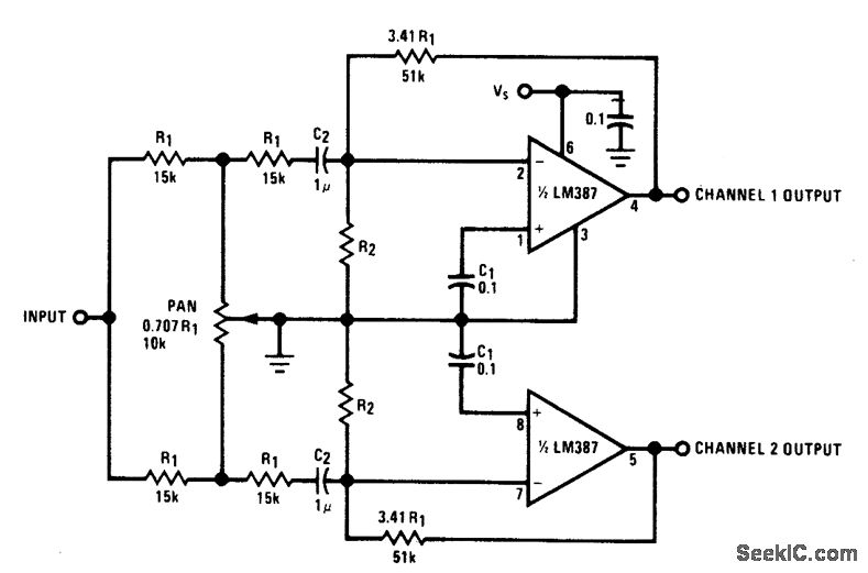 This panning circuit (short for panoramic control circuit) provides the ability to move the apparent position of one microphone's input between two output channels. This effect is oftern required in recording studio mixing consoles. Panning is how recording engineers manage to pick up your favorite pianist and float the sound over to the other side of the stage andback again.