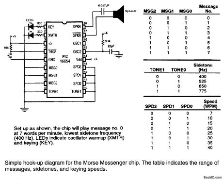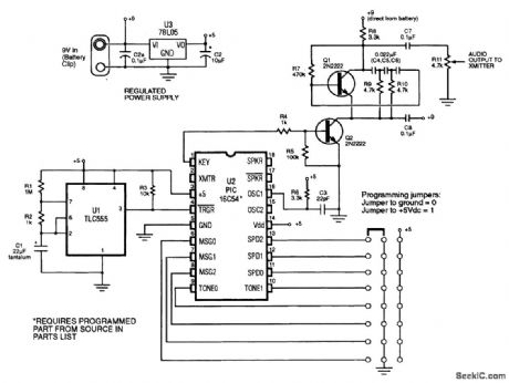 This keyer uses a PIC16C54 micro-controller to generate a Morse code message. The microcon-troller must be programmed to suit users call IC or desired message. (View)