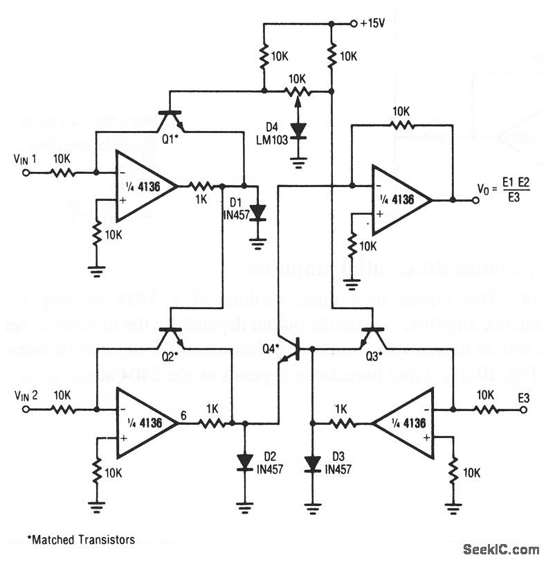 This circuit uses all four sections of a 4136 to form a circuit that both multiplies and divides (simultaneously if required). Virtually any pnp transistors can be used for Q1 through Q4, provided that the transistors are matched. The accuracy of the circuit multiplication and division depends on transistor matching.