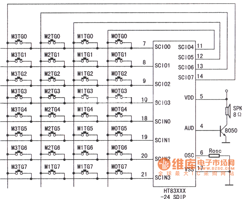 The speech synthesis circuit uses four series more input or output components to form the matrix keyboard. Figure shows HT83XXX series of 32-key application circuit diagram. This series of voice circuits can achieve statement spelling and other functions by plugging the microprocessor (CPU).