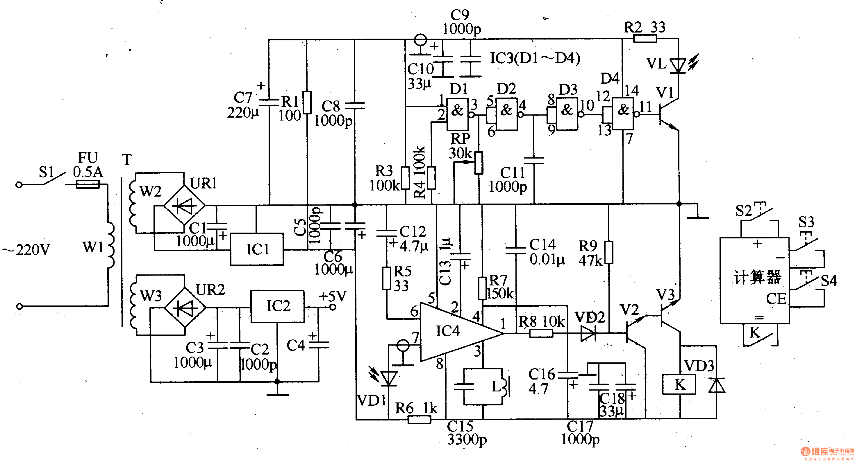 Power circuit is composed of the power switch Sl, fuse FU, power transformer T, rectifier bridge pile URl and UR2, three-terminal voltage regulator integrated circuit lCI and IC2, capacitors Cl-C8 and resistor R1.