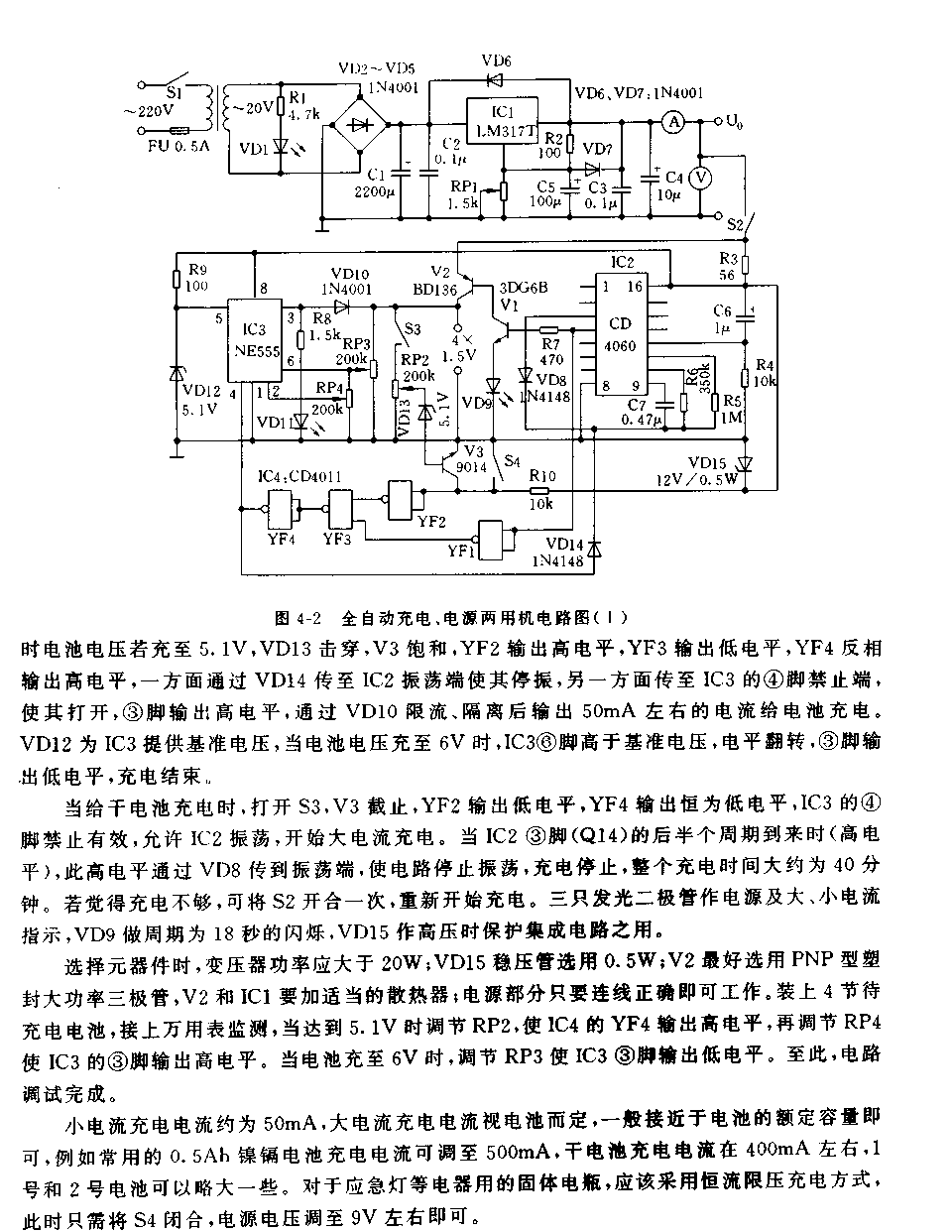 The automatic charging, power supply dual-use device circuit is as shown in the figure 4-2. IC1 is the three-port voltage stabilizer LM317T, it forms the adjustable voltage stabilization power supply, the output voltage can be adjusted in the range of 1.25V-20V through RP1; IC2 is the CD4060, it is designed as one kind of 14-stage binary addition calculator/oscillator, the timer and pulse generator is composed of this calculator/oscillator and the external components. IC3 is the NE555, it forms the simple automatic charging circuit; IC4 is the sampling controller that is composed of the four-two input NAND gate CD4011 to control the conversion of the charging current.
