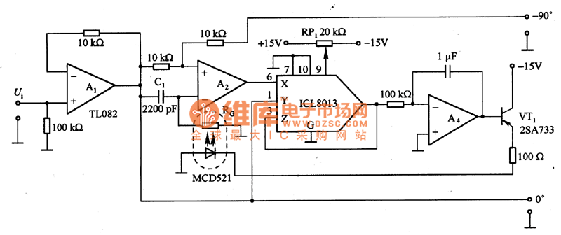 Figure 1 is a automatic trace phase shifting 90 circuit diagram. In the circuit, A1 is a buffer amplifier, which can amplify the input signal below 1 V into several volts. A2 is a phase shifting circuit with stable gain, the amplitude of the output signal is not relevant to the input frequency, it only changes the phase, so it is also called all pass filter.