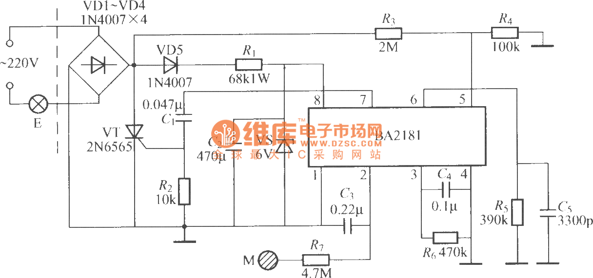 The touching steppingdimmer circuit shown as the chart uses BA2181 dimming ASIC, and it has the features of low power consumption, high anti-interference ability, stable and reliable, security work.