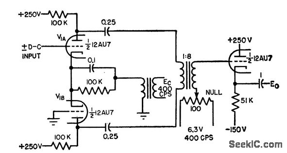 Gives sinusoidal output without filtering-Can be used for either open-loop or error signal modulation when high input impedance and low-distortion sinusoidal output are required. Long-term drift stability is less than 1 mv per hour referred to output.-L. S. Klivans, Modulators for Automatic Control Systems, Electronics, 31:1, p 82-84.