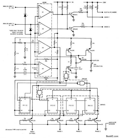 Use of National LM339 quad comparator minimizes number of components needed to drive Burroughs 200-seg-ment gas-discharge bar display. Every third electrode of display is tied together, so only three Iines (phase 1, 2, and 3) control all segments. When phase Iines are driven by consecutive pulses, glow of gas-discharge element is propagated continuously along alray. Anode voltage is gated so number of glowing segments is proportional to analog input. Compar-ators A1 and A2 generate gated anode signals with durations proportional to inputs. A3 compares ramp signal to 2-V reference and generates end-of-scan signal when ramp exceeds reference. A4 generates dock having period of about 60 μ s.-S. N. Kim, Driving Bunoughs' Bar Graph Display, National Semiconductor, Santa Clara, CA, 1975, DB-4.