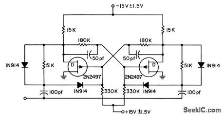 Connected as scale-of-two binary frequency divider, complete with steering diodes, speedup capacitors, and coupling capacitors. Used where speed is not primary consideration.-L. J. Sevin , Jr., Field-Effect Transistors, McGraw-Hill, N.Y., 1965, p 89.