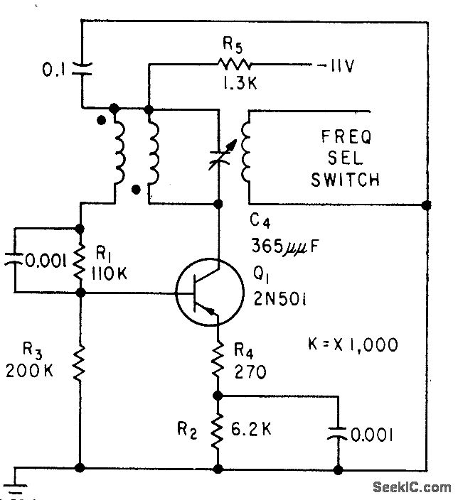 Sine-wave oscillator, tunable over 3:1 frequency range by C4, uses switching transistor. Used in pulse generator for testing high-speed digital computers.-L. Neumann, Transistorized Generator for Pulse Circuit Design, Electronics, 32:14, p 47-49.