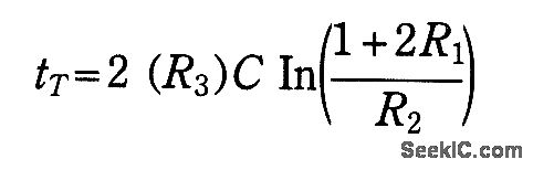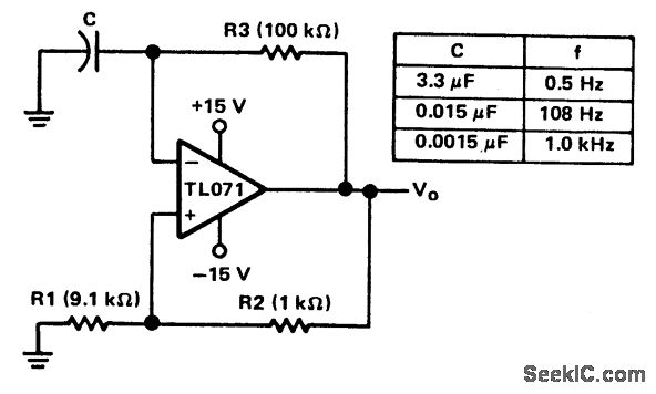 When this circuit is turned on, the natural offset of the devices serves as an automatic starting voltage.Assume that output voltage VO goes positive and the positive feedback through R2 and R1 forces the out-put to saturate. The high-voltage level at VO, then charges C through R3, until the voltage at the inverting input exceeds that at the noninverting input.As the inverting input exceeds the noninverting input level, the output switches to the negative saturation voltage. This action starts the capacitor discharging toward the new noninverting input level. When the capacitor reaches that level, the op amp switches back to the positive saturation voltage, and the process starts again. With the TL071, the positive and negative output levels are nearly equal, which results in a 50% duty cycle. The total time period of one cycle will be: