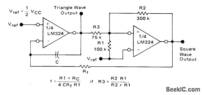 Requires only two sections of LM324 quad differential-input opamp to provide choice of triangle or squarewave outputs at frequency determined by values of components. Supply voltage range is 3-32 V.- Quad Low Power Operational Amplifiers, Motorola, Phoenix,AZ, 1978, DS 9339 R1.