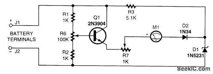 Zener diode D1 creates a reference voltage to which the battery voltage is compared. The diode specified has a breakdown voltage of 5.1 V. That rating will work fine with most six- or seven-cell NiCd battery packs, as well as with 12-V lead-acid batteries. The circuit can be customized for a particular battery by selecting a unit for D1 that has a voltage rating about 1 V below the completely discharged voltage of the battery pack that you wish to measure. Transistor Q1, an emitter-follower amplifier, greatly increases the sensitivity of the circuit over what it would be if R7 were connected directly to the wiper of R6. A further advantage to that arrangement is that it reduces the current drain that flows through RI, R2, and R6. By amplifying the current flowing through the resistors, the resistance value can be increased to a very high value, lowering the total current draw of the circuit. Resistor R6 adjusts the meter to read 0 mA when the battery is completely discharged and R7 adjusts the meter to read 1 mA when the battery is fully charged. If the circuit were accidentally connected backward to the battery, current would flow through D1 and M1. The transistor would become re-verse-biased, allowing a complete path back to the battery. That situation would allow excessive current to flow through D1, M1, and Q1, destroying them in the process. D2, R1, and R2 are included to prevent any current flow in case the battery is reversed.