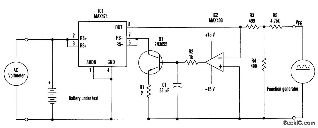 By applying an ac voltage superimposed on a ten times larger negative dc voltage (at VFG), the function generator determines the battery current drawn by Q1 (see the figure). The generator voltage causes the op-amp (IC2) output to go high and turn Q1 on, which allows battery current to flow through the high-side current-sensing amplifier (IC1). The output current of IC1, on pin 8, is equal to 1/2000 of this battery current. As a result, IC1, IC2, and Q1 form a loop in which the op amp forces a virtual ground at the IC1/IC2 end of R3. The op amp's extremely low-voltage offset (10 μV maximum) ensures accuracy. This virtual-ground condition enables the voltage divider (R5, and R3 in parallel with R4) and the function generator to determine the voltage across R3. The resulting current in R3 is iR3 = RP X VFG/【(RP+R5)R3】, where RP is the parallel combination of R3 and R4. Substituting resistor values and noting that battery current (iB) is 2000 times iR3,iB=-VFG/5.To operate the circuit, set the function generator's ac voltage to approximately 10 percent of its dc component. The equation then gives the resulting ac current in the battery (iB). Using an ac voltmeter, you can measure the ac voltage across the battery (vB) and calculate the average cell impedance as vB/NiB, where N is the number of cells. The circuit easily accommodates battery voltages of 3 V or more.