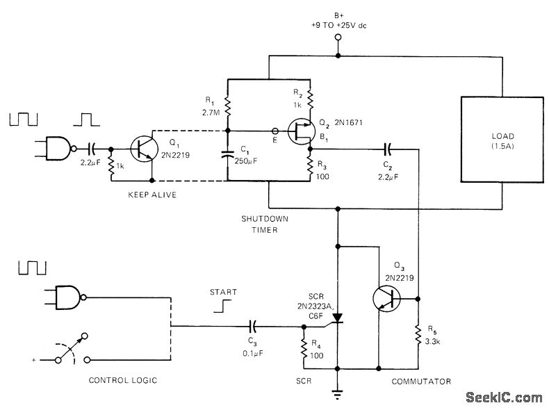 Developed for use with alarms, remote controls, or unattended electronic equipment, to turn off battery auto-matically at predetermined interval after circuit is actuated by control logic or switch. Turn-on applies positive pulse that triggers SCR on, grounding load and UJT timer Q2. After delay interval determined by values of C1 and R1, Q2 fires and discharges C1, producing pulse across R, that tums on Q3. This in tum shunts SCR and commutates it off. Circuit is thus turned off, after which only very small leakage currents through reverse SCR junction will be drain on battery.-D. Weigand, Battery Saver Has Automatic Tum-Off, EDN Magazine, April20, 1973, p91.