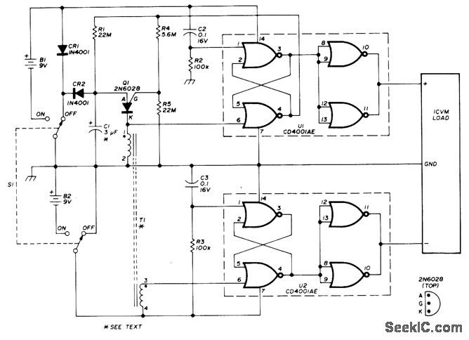 Tums off battery-powered IC VTVM automatically about 3.5 min aftertuning on with S1, to prolong battery life even though user forgets to tum off instrument. Circuit can be retriggered at any time in timing cycle by switching S1 off and then on again. Q1 is programmable UJT that drives latch using two gates of CD4001AE quad N0R gate U1. With pin 3 high and pin 4 low, timing circuit and load are both turned off; battery drain by U1 is then only 0.001 μA. Values of R1 and C1 determine time interval, T1 is air-core pulse trans-former having 600 tums (No. 36 to 401 enamel for primary and same number wound over primary for secondary.-R. Hardesty, Tum-Off Timer for Portable Equipment, Ham Fladio,Sept. 1976, p 42-44.