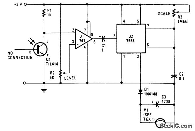 A TIL414 photo transistor senses reflection from a spoke-mounted reflector, generates a pulse, and sends it to U1 and U2, a monostable multivibrator, which drives meter M1.