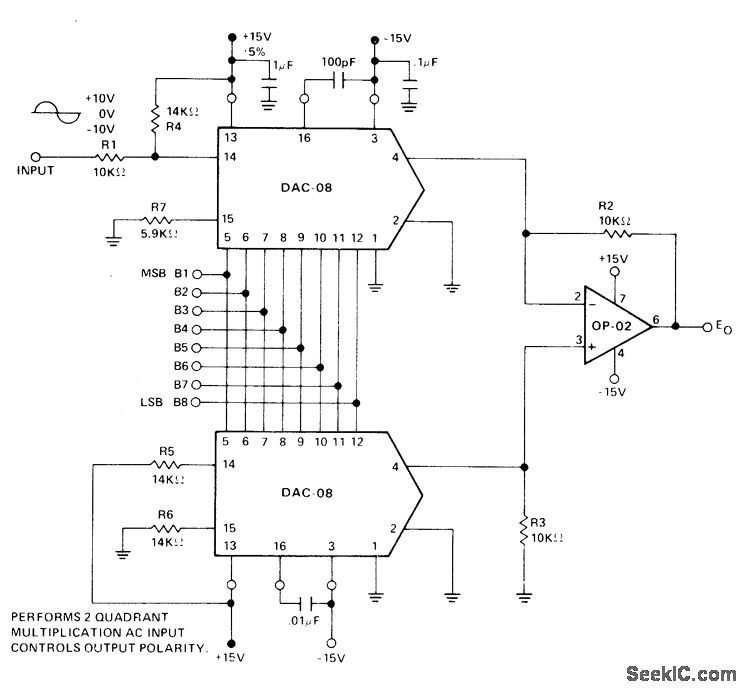 Bipolar reference voltage for upper Precision Monolithics DAC-08 D/A converter modulates reference current by ±1.0 mA around quiescent current of 1.1 mA. Lower DAC-08 has same 1.1-mA reference current and effectively subtracts out quiescent 1.1 mA of upper reference current at all input codes since voltage across R3 varies between -10 V and 0 V. Output voltage E0 is thus product of digital input word and bipolar analog reference voltage.-J. Schoeff and D. Soderquist, Differential and Multiplying Digital to Analog Converter Applications, Precision Monolithics, Santa Clara, CA, 1976, AN-19, p 3.