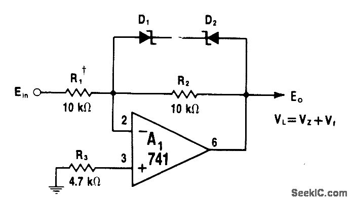 Circuit limits opamp output swing in either direction to sum of zener- and forward.breakdown voltages of D1 and D2. With matched zeners, positive and negative limiting levels are symmetrical. With 10-V zenets, limiting occurs at 10.6 V (10.0 + 0.6 V) to allow linear t 10 V swing without saturating A1. R2 is selected according to gain requirement. Diodes are matched pair chosen to provide desired limit voltage, such as 1N758 for ±10 V output swing.-W. G. Jung, IC 0p-Amp Cookbook, Howard W. Sams, Indianapolis, IN, 1974, p 201.