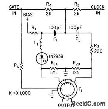 Portion of gate input signal is fed to wire threading output toroid, to cancel output spike of ac bridge.-F. W. Kantor, Tunnel-Diode Gate has Sub-nanosecond Rise Time, Electronics, 35:15, p 62-64.