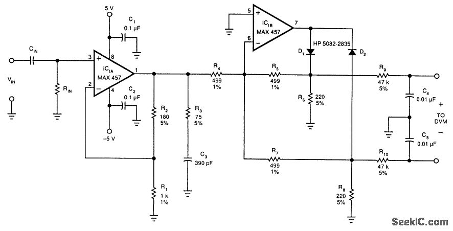This circuit converts sine waves of up to 1-V rms into an equivalent dc level. It should prove useful as an ac broadband voltmeter. IC1 is an input amplifier that converts level from rms to an equivalent dc level and feeds ICB1. R3 and C3 are stabilizing components. IC2 acts as a full-wave rectifier. R6, R5, and D1 rectify positive levels, R7, R8, and D2 negative-going signals. R9, R10, C4, and C5 are low-pass filters.The output can feed a DVM or another meter.