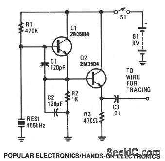 Transistor Q1, along with piezoelectric ceranuc resonator RES1, make up a simple rf oscillator that operates either at or near the AM-radio, 455-kHz, i-f frequency. That means that the second or third harmonic signal can easily be picked up by the receiver. Transistor Q2 is connected to an emitter-follower circuit to protect the oscillator from output loading; that helps to stabilize the output frequency and signal level.