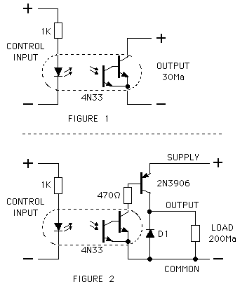 The relays are based on a 4N33 Optoisolator package. This device has a Darlington output transistor and as the first figure shows it can be used alone for low power applications of up to 30Ma. The second figure shows a version for higher current loads of up to 250Ma.