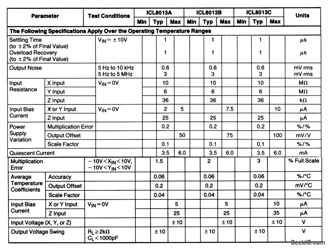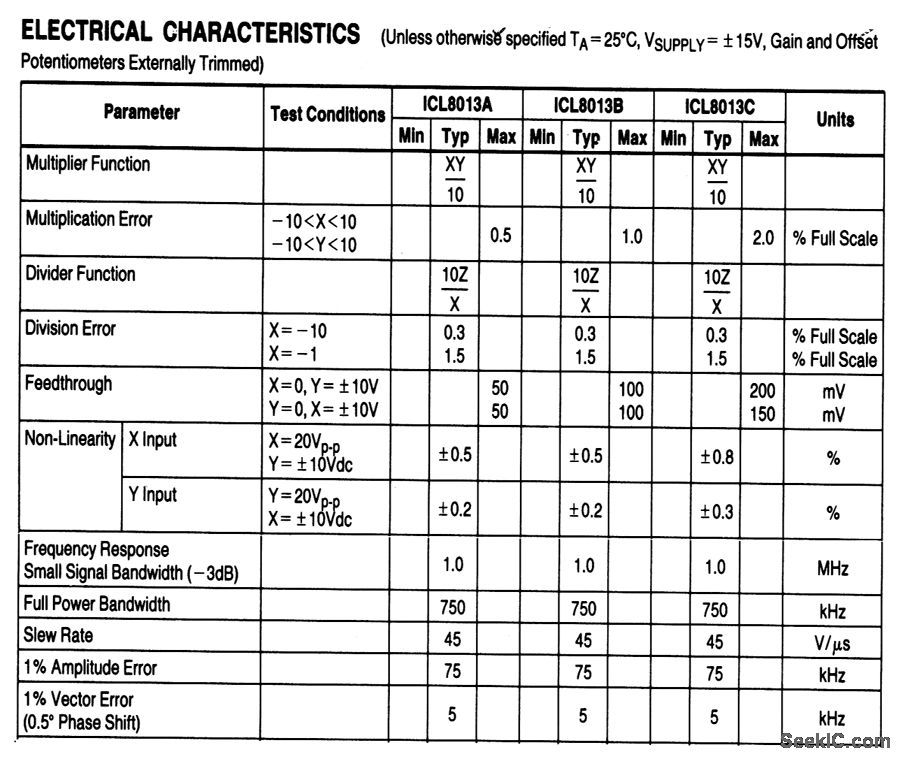 This circuit shows an ICL8013 four-quadrant multiplier connected as a basic multiplier. Figure 3-15B shows the pin connections and functional diagram. Figure 3-15C shows the electrical characteristics. Figure 3-15D shows the connections for trimming offset and feedthrough. Use the following trim procedure.