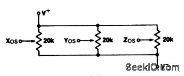 1. Set XIN= YIN= 0 V, and adjust Z0S for zero output.2. Apply a±10-V low-frequency (below 100 Hz) sweep (sine or triangle) to YINwith XIN 0 V, and adjust X0S for minimum output (chapter 5 contains several sweep-generator circuits).3. Apply the sweep signal of step 2 to XIN with YIN= 0 V, and adjust Y0s for minimum output.4. Readjust Z0s, as in step 1, if necessary.5. With XIN =10.0 Vdc, and the sweep signal of step 2 applied to YIN, adjust the gain potentiometer until the output equals YIN. This can be done with a differential scope plug-in (A + B) by inverting one signal and adjusting the gain control for (output - YIN)=0.