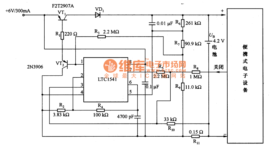 The above picture is battery charging circuit of LTC1541.It is charging circuit of portable electronic devices and LTC1541 is composed of reference voltage,comparator and operational amplifiers, etc. High precision reference voltage (plus or minus 0.4%) will adjust lithium-ion battery floating voltage to± 1.2% and this is the value that most manufacturers require.VT1 transistor is used to adjust battery charge current and operational amplifier input(feet 1) of LTC1541 amplifies VT1 base current via VT2.VD1 diode is to prevent reverse current circulation produced by adapter or power control failure.Because the circuit is linear regulators, VT1 power consumption needs to be considered.