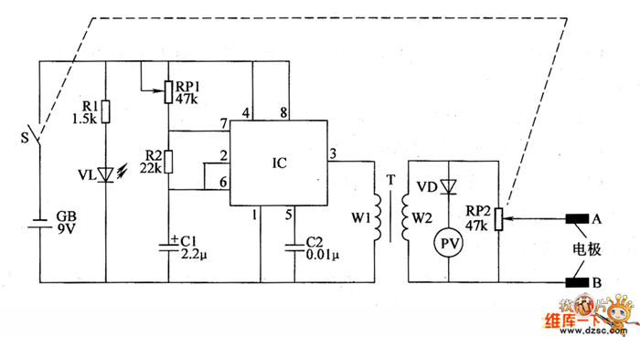 The biological taking poison device circuit is composed of the power supply circuit, multivibrator and output circuit, and the circuit is shown in Figure 37. Power supply circuit consists of the power switch S, battery GB, current limiting resistor R1 and the power indicator light-emitting diode VL. Multivibrator is composed of the capacitors C1, C2, resistor R2, potentiometer RP1 and time-base integrated circuit IC. Output circuit is composed of the pulse transformer T, potentiometer RP2, voltmeter N and electrodes A, B. R1 and R2 use the l/4W carbon film resistors or metal film resistors. RP1 uses the WH series of small synthetic membrane switch potentiometer without switch; RP2 uses the WH series of small synthetic carbon film potentiometer with switch.
