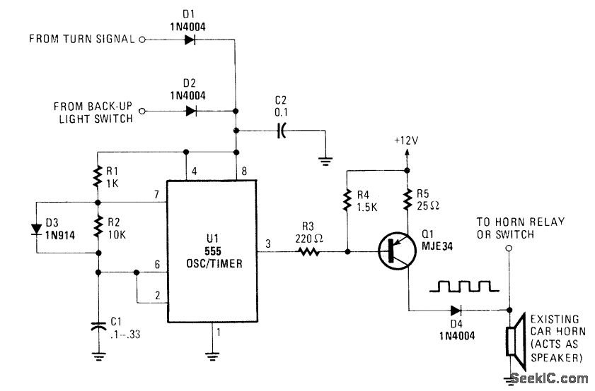 An auto horn will work as a speaker of limited audio-frequency range. This circuit uses a 555 timer as an oscillator to drive an MJE34 transistor, which in turn drives the horn. Normal horn operation is ensured by blocking diode D4.
