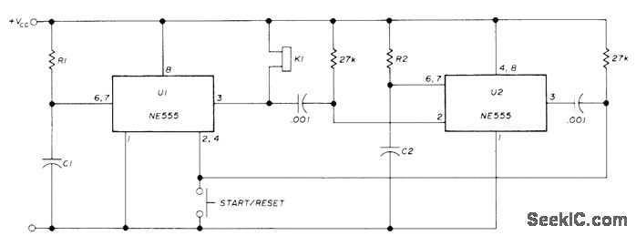 Two timers, each controlling own load andhaving own time intervals (determined by R1C1 and R2C2), recycle automatically when start switch is closed momentarily. If desired, second timer can be set to control ON time offirst timer With 15-V supply, each timer canhandle 200-mA load.-H .Vordenbaum'Automatic Beset Timer,Ham Radio Oct,1974、p50-51.
