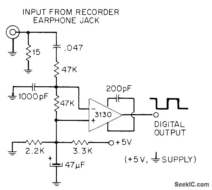 Converts low-level digital signals from cassette recorder into CMOS-compatible 5-V square waves. Both in-puts of 3130 opamp are biased to +2 V for use as open-loop comparator. RC input filter minimizes hum and bias interference.-D. Lancaster, CMOS Cookbook, Howard W. Sams, Indianapolis, IN, 1977, p 345.