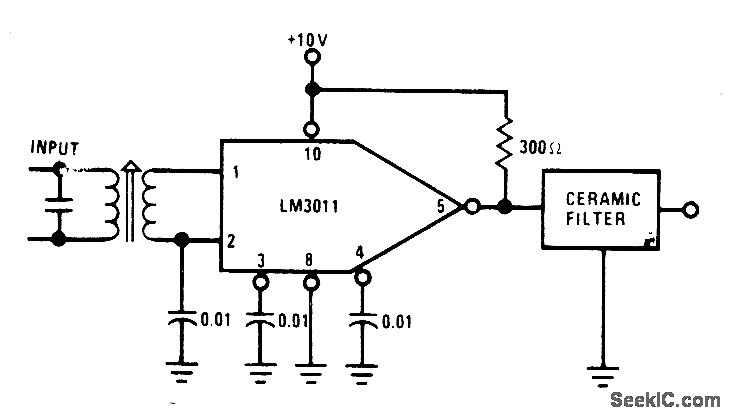 National LM3011 gain block provides three differential stages and current-source output suitable for driving 300-ohn,ceramic filter in IF amplifier of FM receivel,Circuit provides 60 dB of power gain to matched load.-''Audio Handbook,''National Semiconductor,Santa Clara,CA,1977,p 3-11-3-12.