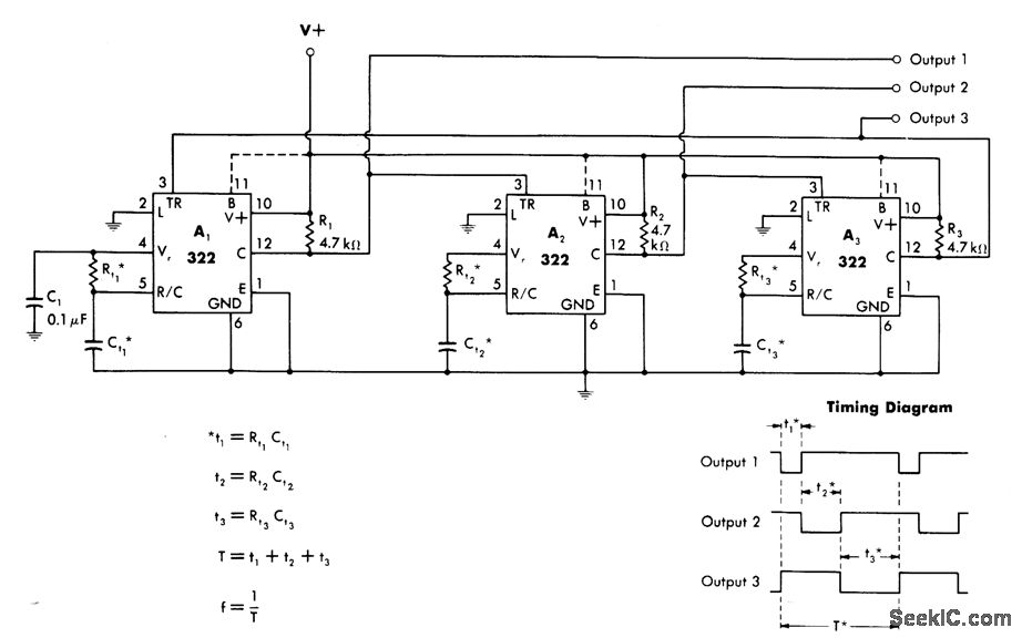 Gross-connected 322 mono MVBRs. operating as astables、are interconnected so individual timing periods are generated in sequence as shown.Total period T is sum of three individual periods, after which cycle repeats itseff. Chain may be extended further if desired. Useful when prescribed sequence of timing events is required. Equations glve values of R and C for timing periods ranging from 10 μS to several minutes-W G .Jung、 IC Timer Cookbook. Howard W,Sams.Indanaplis.IN.1977.p125-128.