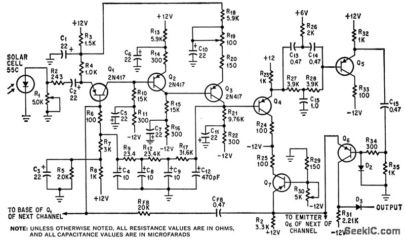 Circuit shows one channel of solar-cell sigmctl amplifier and section of switching bolck for experimental character recognition system.-P.H. Howard, Feedback System Detects 1% Amplitude Difference,Electronics,38:10,p68-70