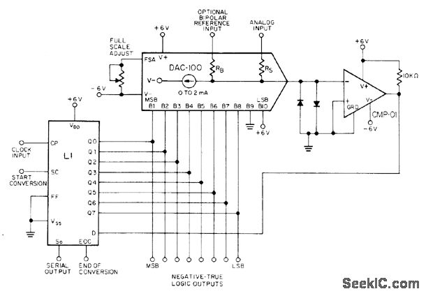 Converts analog inputto 8-bit digital output by using MC14559 CMOS successive-approximation registerwith Precision Monolithics DAC-100 D/A converter and CMP-01 comparator. Conversion sequence is initiated by applying positive pulse, with width greaterthan one clock cycle, to START CONVERSION input. Analog input is then compared successively to 1/2 scale, 1/4 scale, and remaining binarily decreasing bit weights until it has been resolved within 1/2 LSB. END OF CONVERSION then changes to logic 1 and parallel answer is present in negative-true binary-coded format at register outputs.—D. Soderquist, Interfacing Precision Monolithics Digital-to-Analog Converters with CMOS Logic, Precision Monolithics, Santa Clara, CA, 1975, AN-14, p 4.