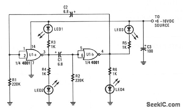 Uses a low cost CMOS IC to turn four LEDs on and off at a rate that is set by the values of R1, R2, C1, and C2. The pulse rate for the component values given for R1 and R2 is about one cycle every four seconds. By lowering the values of R1 and R2 to 220 KΩ, the pulse rate increases to 1 Hz. The LEDs flash in pairs, with LED1 and LED4 tuming together for one half of the time period, while LED2 and LED3 are on for the other half. The on/off duration of each pair of LEDs can be increased or decreased by changing the value of one of coupling capacitors C1 or C2. Increasing either capacitor's value by a factor of 10 will also increase the ON time of a pair of the LEDs for about the same factor.