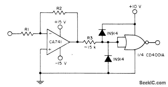 Clamp diodes and single resistor provide interface between CMOS circuit and opamp operating between normal ±15 V supply rails. Diodes ensure that CMOS input voltage does not go outside permissible range.- COS/MOS Integrated Circults, RCA Solid State Division,Somerville,NJ,1977,p 629