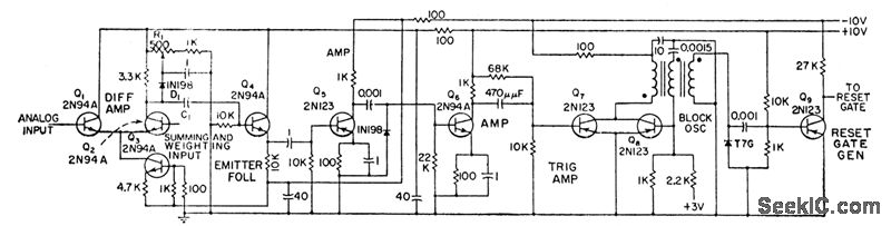 Comparator action begins when summing and weighting output exceeds analog input and negative pulse is coupled through C1. Trailing edge of blocking oscillator pulse activates reset-rate generator.-W.B. Towles, Transistorized Ancdog-Digital Converter, Electronics, 31:31, p 90-93.