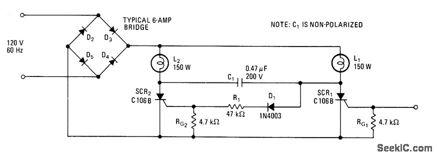 Control unit for stage lighting fades out one lamp while simultaneously increasing light output of another with accurate tracking. Gate of silicon controlled rectifier SCR1 is driven by standard external phase control circuit. Interlock network connected to output of SCR1 provides complementary signal for trigger of SCR2. If lamps larger than 150 W are required, use largervalue for C1.-M. E. Anglin, Complementary Lighting Control Uses Few Parts, Electronics, Dec. 12, 1974, p 111; reprinted in Circuits for Electronics Engineers, Electronics, 1977, p 78.