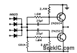 Alternately provides 500-na base current to pnp and npn transistors, thereby using transistor rise time at both edges of switching pulse to eliminate R-C time constant fall times of output wave form. Design reduces power drain and speeds up rise and fall times by factor of 15.-R. A. Tietsch, Complementary Microwatt Logic Circuits, EEE, 11:8, p 51-52.