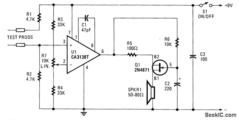 U1 is an op amp used as a comparator. When the test probes are shorted together, resistors R1 and R2 bias the noninverting input to half the supply voltage. The inverting input is biased by a voltage divider that consists of R3, R7, and R4. Resistor R7 is adjusted so that the voltage to the inverting input is lower than that to the noninverting input when the probes are shorted together. With continuity across the probes, U1's output goes high and supplies power to Q1, which is configured as arelaxation oscillator. The output of Q1 is fed to a high-impedance loudspeaker for an audio tone. When the probe is open, the nonin-verting input goes to the negative supply rail via R2. This action forces U1 is output low, which results in no output from the oscillator.