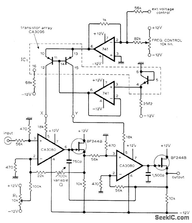 Frequency at which rolloff starts can be set in range between 15 and 15,000 Hz by extemal voltage or current. If only manual control of frequency is required, short points X and Y and conned them to wiper of 10,000-ohm logarithmic potentiometer that is positioned between -12 V and ground.-T.Orr, Voltage/Current Controlled Filter, Wireless World,Nov.1976, p 63.