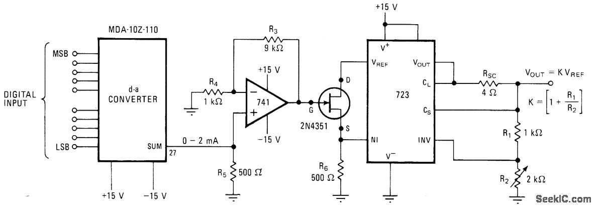 Digital control of D/A converter determines output voltage of regulator, with FET serving as voltage-variable resistor. Applications include generation of sequence of voltages for testing components or equipment. Analog Devices MDA-10Z-110 converter generates 0-2 mA output with resolution determined by 10-bit digital input. 741 opamp transforms current to 0-6 V output for varying output of 723 regulator over range of 7-37 V at 150mA maximum.-C. Viswanath, D-A Converter Controls Programmable Power Source, Electronics, July 21, 1977, p 125.